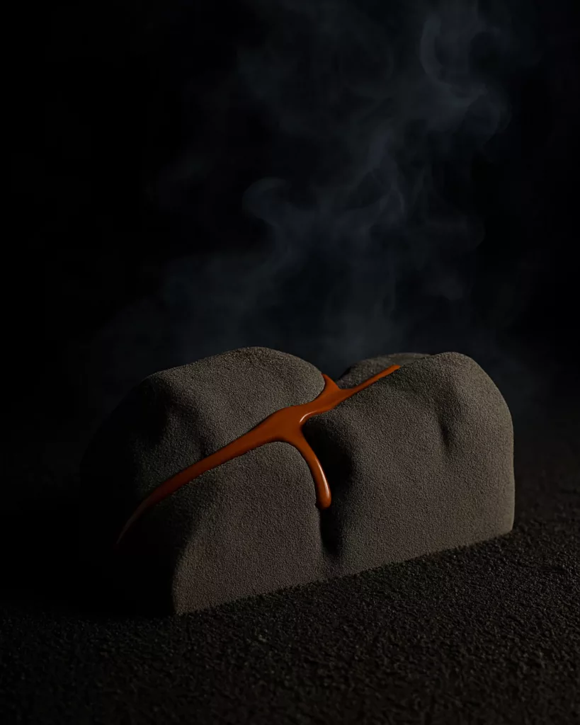 Cette année, Philippe Tayac propose encore une fois 3 bûches mais arrêt sur image sur la bûche Java qui est sans Gluten ! Cette bûche signature a été imaginée comme une véritable invitation au voyage. À l’approche des fêtes, moments précieux de partage et de générosité, le Chef dévoile une création empreinte de sens, inspirée par ses racines indonésiennes, son amour profond des saveurs et son désir sincère de faire plaisir. Véritable pièce maîtresse de la table de Noël, cette bûche puise son inspiration dans l’un des joyaux naturels de l’Indonésie, le majestueux volcan Kawah Ijen, et se distingue par son élégance et son intensité aromatique. Elle révèle une composition gourmande et équilibrée mêlant praliné de noix de cajou, ganache montée vanille-cajou et croustillant au chocolat blond.